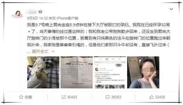 杨女士在微博上称,她已怀孕32+周,7日晚,她和丈夫牵狗散步回家,在君尚金座酒店门口,一只没有牵绳的狗(法国斗牛犬)突然朝她身上猛扑,一旁的丈夫为了保护她,于是用脚将狗推开。边上一名女子立马上前指责,为什么无缘无故踢她的狗?随后双方发生口角,这时女子的母亲也加入了进来,不停辱骂和诅咒肚子里的孩子,之后还和女儿两人一起撕扯孕妇的头发,狠推她的肚子。