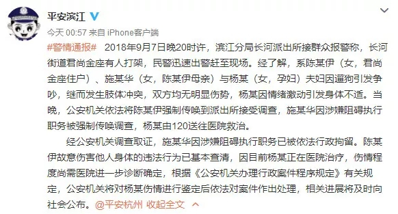 2018年9月7日晚20时许,滨江分局长河派出所接群众报警称,长河街道君尚金座有人打架,民警迅速出警赶至现场。经了解,系陈某伊(女,君尚金座住户)、施某华(女,陈某伊母亲)与杨某(女,孕妇)夫妇因遛狗引发争吵,继而发生肢体冲突,双方均无明显伤势,杨某因情绪激动引发身体不适。当晚,公安机关依法将陈某伊强制传唤到派出所接受调查,施某华因涉嫌阻碍执行职务被强制传唤调查,杨某由120送往医院救治。