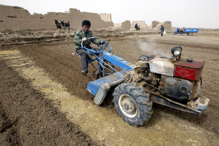 2006年4月,民勤县西渠镇煌辉村农民盛红强正在翻耕干裂的土地,他的身后是破败的家园。摄影/章轲