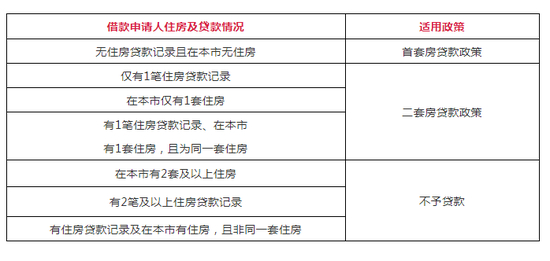 也就是说,借款申请人如果名下无住房贷款记录且在本市无住房的,按首套房贷款政策办理;凡不属于首套房情形,被核定为是二套房的,按二套房贷款政策办理;如果被核定为有两套及以上住房的,也不予贷款。