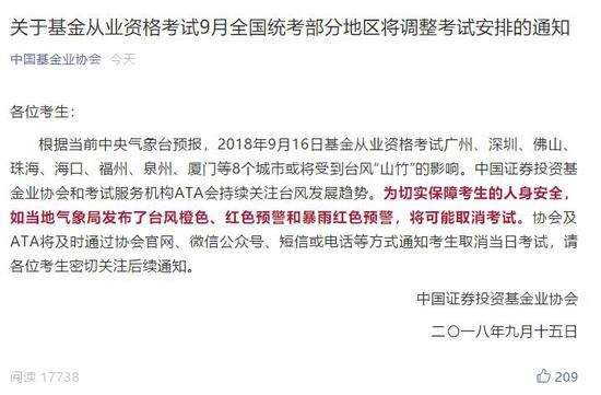 根据当前中央气象台预报,2018年9月16日基金从业资格考试广州、深圳、佛山、珠海、海口、福州、泉州、厦门等8个城市或将受到台风“山竹”的影响。中国证券投资基金业协会和考试服务机构ATA会持续关注台风发展趋势。为切实保障考生的人身安全,如当地气象局发布了台风橙色、红色预警和暴雨红色预警,将可能取消考试。协会及ATA将及时通过协会官网、微信公众号、短信或电话等方式通知考生取消当日考试,请各位考生密切关注后续通知。