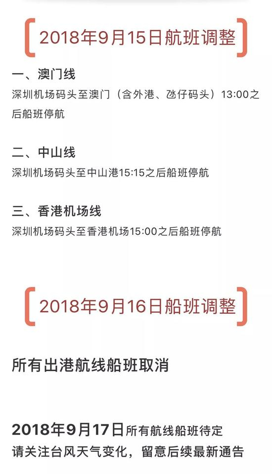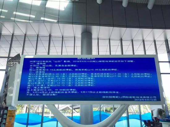 因受今年以来最强台风“山竹”的影响,为保障旅客及船舶航行安全,2018年9月15日—9月16日深圳机场码头船班作如下调整: