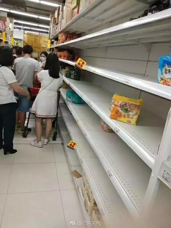 泡面货架几乎被清空,其他饼干、面包、饮用水等也陆续被扫光。