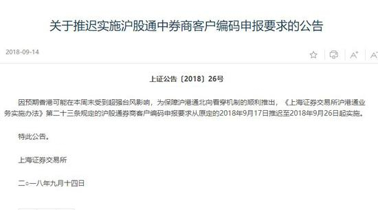 上交所:因预期香港可能在本周末受到超强台风影响,为保障沪港通北向看穿机制的顺利推出,《上海证券交易所沪港通业务实施办法》第二十三条规定的沪股通券商客户编码申报要求从原定的2018年9月17日推迟至2018年9月26日起实施。