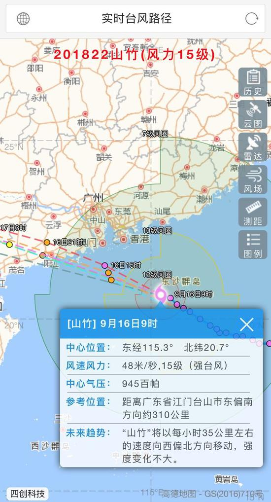 据中央气象台,今天(16日),南海北部及广东沿海大部、香港、澳门将有11~13级大风,阵风14~15级,“山竹”中心经过的附近海面或地区风力可达14~16级,阵风17级或17级以上。