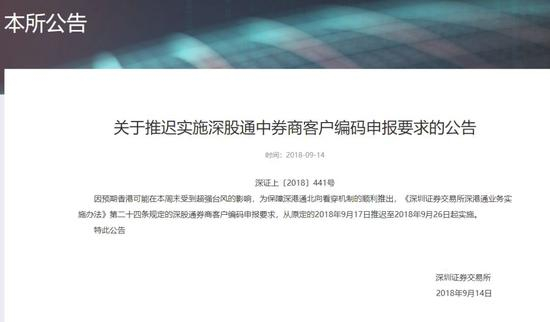 深交所发布公告:因预期香港可能在本周末受到超强台风的影响,为保障深港通北向看穿机制的顺利推出,《深圳证券交易所深港通业务实施办法》第二十四条规定的深股通券商客户编码申报要求,从原定的2018年9月17日推迟至2018年9月26日起实施。
