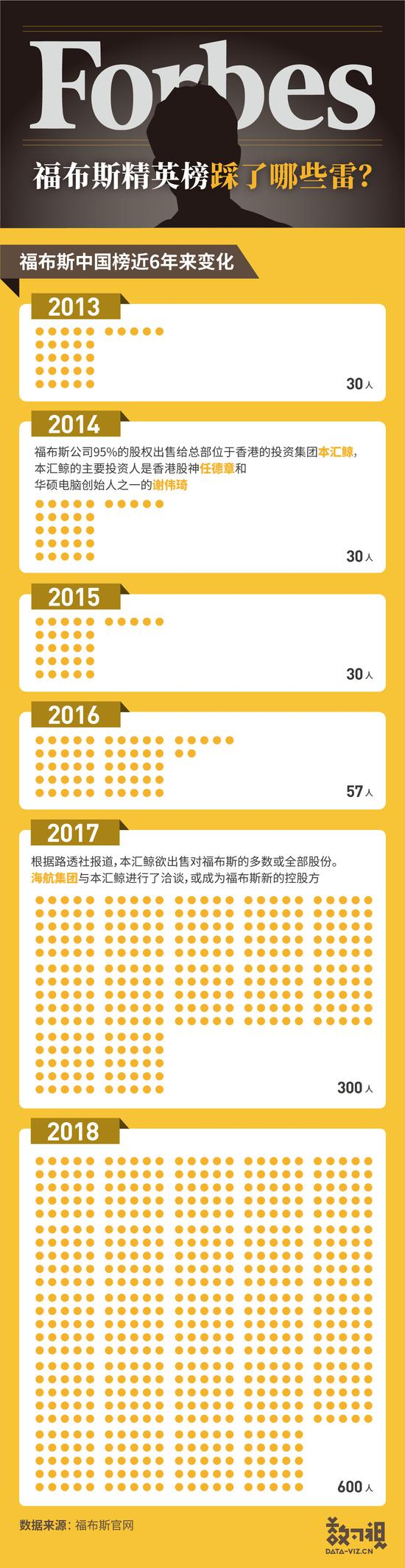 在2013到2015年的评比里面,福布斯每年都是遴选30个中国青年企业家上榜。到了2017年,“中国榜”扩充到了10个类别和总计300位入选人;到2018年,这个榜单再度扩充到20个类别和总计600个入选人。