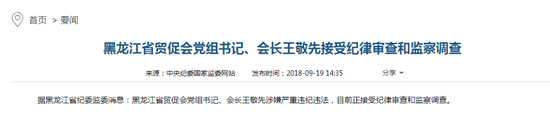 19日,黑龙江省纪委监委消息,黑龙江省贸促会党组书记、会长王敬先涉嫌严重违纪违法,目前正接受纪律审查和监察调查。