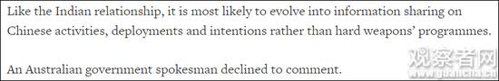 报道同时披露,台当局也在推动与澳大利亚之间的更紧密合作,相关讨论仍在探索阶段。但跟印度一样,合作很可能会是分享大陆部署、意图等信息,而非武器项目。随后澳大利亚政府发言人对此拒绝置评。