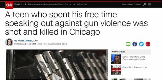 更令人心痛的是,一名今年9月8日才刚遇害的美国少年,此前一直在为消除美国的枪支暴力而奔走,从事着志愿者的工作。然而他还是未能逃过被枪支剥夺生命的悲剧……而且根据美国CNN的报道,这个孩子只是在大街上行走时,就被人开枪打死了……