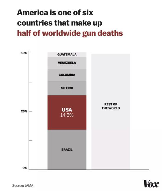 另外,美国新闻媒体VOX的一组数据也显示,在2016年全世界约25万条被枪支暴力夺走的生命中,有一半来自包括美国在内的6个国家,其中美国“贡献”了这50%里的14.8%,即3.72万人——可问题是,除了美国外的那5个国家,都是社会本来就很动荡的拉美国家……