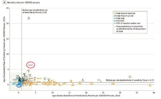 上图是美国媒体提供的一个涉及全球多个国家的枪支暴力数据,其中纵轴是每10万人里用枪自杀的比例,横轴是每10万人里因枪支他杀案而丧生的比例,可以看到红圈里的美国属于“双高”,而小蓝圈里的中国(CHN)则在这个坐标中最贴近0的位置,属于“双低”。