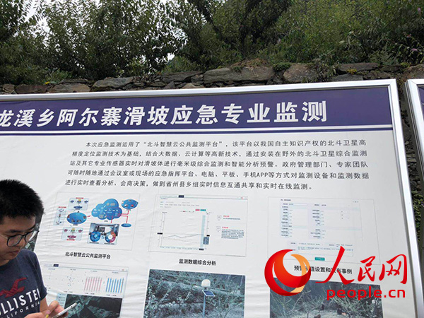 县国土资源局相关负责人介绍龙溪乡阿尔寨滑坡应急专业监测平台。(人民网 朱江 拍摄)