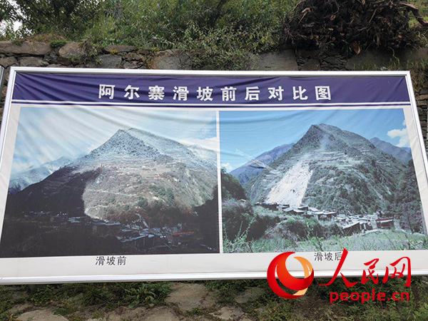 阿坝州汶川县龙溪乡阿尔村阿尔寨滑坡前后对比图。(人民网 朱江 拍摄)
