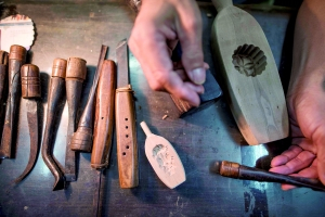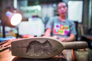 饼印,就是制作糕饼的模具。在店里,余兆基最常做的事情便是埋头伏案,刻制一个又一个饼印。在他的桌面上,只见摆着各种各样的工具。“这里很多工具都是一代一代传下来,有些甚至有着百余年的历史。”余兆基说,刻不同的图案要用到不同的工具,因此他的工具也越积越多。