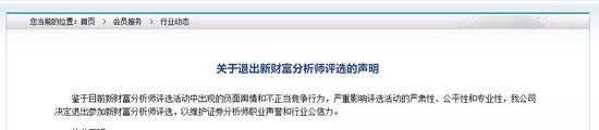在当天的下班时间,证券业协会官网公布了30家券商《关于退出新财富分析师评选的声明》。声明称:“鉴于目前新财富分析师评选活动中出现的负面舆情和不正当竞争行为,严重影响评选活动的严肃性、公平性和专业性,30家证券公司决定退出参加新财富分析师评选,一些证券公司中以个人名义参评的人员也表示退出评选。”