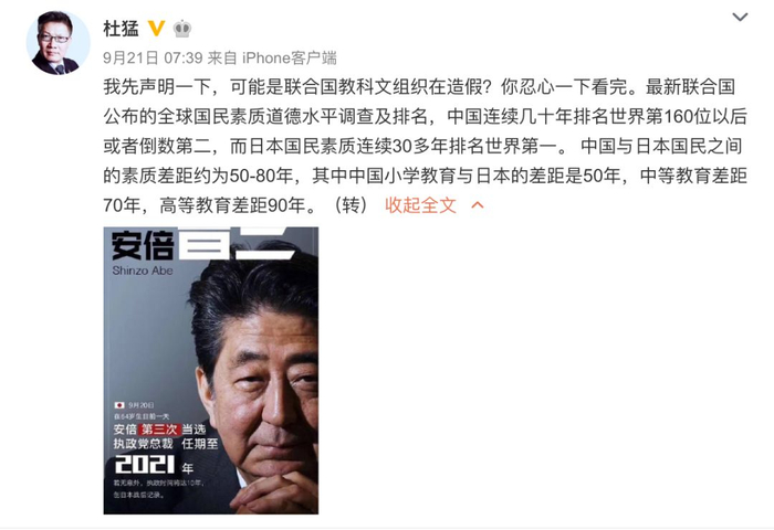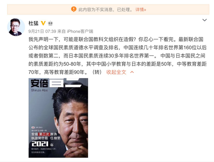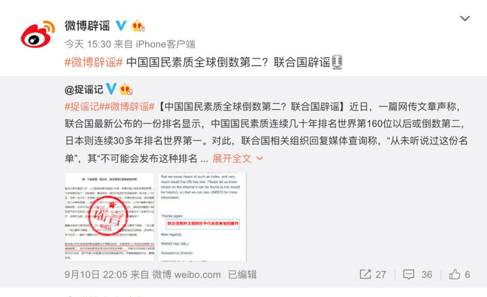 然而,这已经不是类似的谣言第一次出现了,据新浪微博虚假消息辟谣官方账号@微博辟谣 发布,早在9月10日就开始有类似的内容在网上流传。其中在一篇名叫《换一个角度看一看日本,你不知道他的家底有多厚》的文章中就有了“最新联合国公布的全球国民素质道德水平调查及排名,中国连续几十年排名世界第160位以后或者倒数第二,而日本国民素质连续30多年排名世界第一”的说法。而联合国相关组织在回复媒体问询时还一脸懵圈地表示,“从未听说过这份名单”,希望记者能够提供一下这份调查的原始出处,他们自己也想“拜读”一下。
