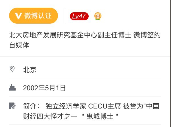例如,他自称是北大房地产发展研究基金中心副主任博士,著名的独立经济学家,经济学博士,被誉为中国四大财经怪才之一、鬼城博士。还称自己是在北京大学内担任北京大学房地产发展研究基金中心副主任,北京大学房地产校友会副会长等等等等。