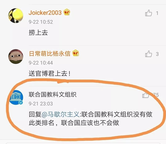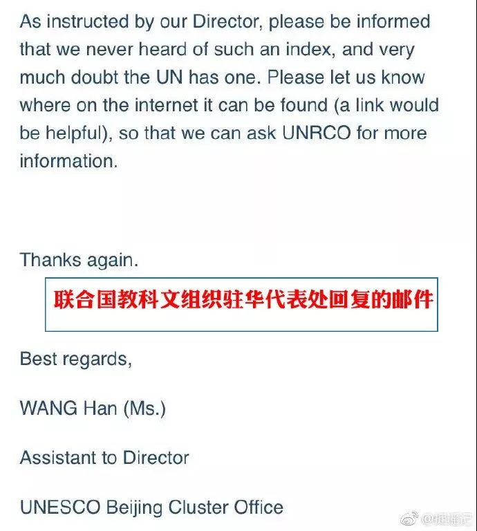 不料这份帖子越传越广,终于传到了联合国教科文组织“本尊”那里了。联合国教科文组织官方微博@联合国教科文组织 赶紧出面表示“联合国教科文组织可没有做过此类排名,联合国应该也不会做。”