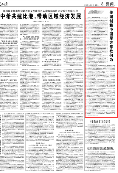 特朗普政府上台以来,美方抱守冷战思维,将中国列为“战略竞争者”,加大对华防范遏制。除对中国输美产品加征关税外,美阻挠“中国制造2025”、制裁中兴公司、将44家中国企业列入出口管制清单、出台《外国投资风险审查现代化法案》,此次更是剑指中国军工装备部门,可谓环环相扣、“一脉相承”,根本目的是打压中国高新科技发展,迟滞中国国防现代化建设。
