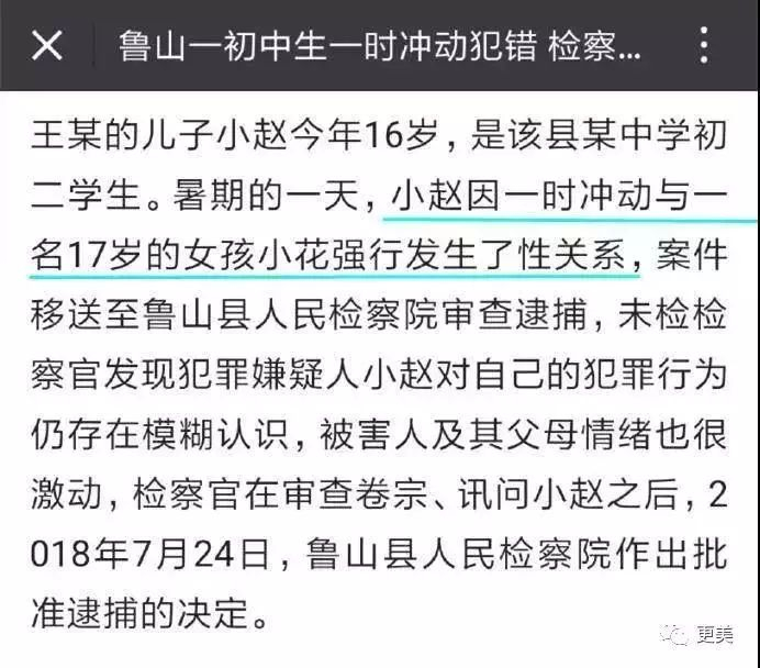 前面已经说到,其微信推文用的标题是《鲁山一初中生犯错 检察官介入下双方冰释前嫌》。一场未成年人性强奸案中,即便取得了被害人及其家人的谅解,又如何能达到“冰释前嫌”“握手言和”的程度?遑论该微信文章还大肆强调“小赵家长赔偿了小花父母8万元”。