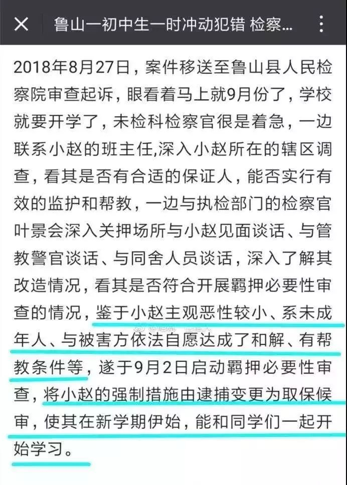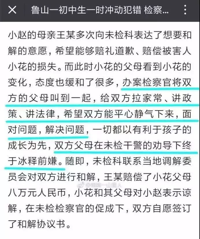 舆情起自鲁山检察院官方微信公众号一篇名为《鲁山一初中生犯错 检察官介入下双方冰释前嫌》的文章:
