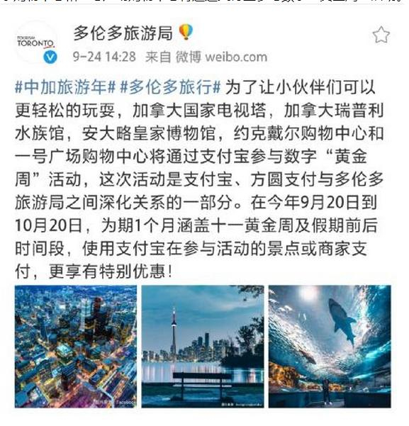 今年还是中加旅游年,多伦多旅游局也十一前期在官方微博宣布:为了让小伙伴们可以更轻松的玩耍,加拿大国家电视塔、加拿大瑞普利水族馆、安大略皇家博物馆、约克戴尔购物中心和一号广场购物中心将通过支付宝参与数字“黄金周”活动。