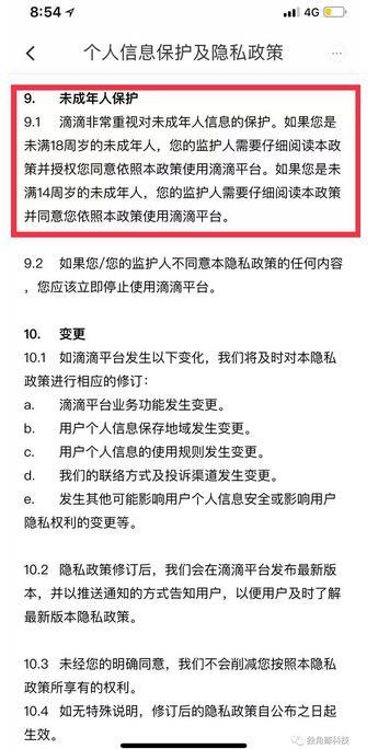 新京报独角鲸科技(ID:dujiaojingkeji)查阅滴滴客户端发现,在个人信息保护及隐私政策中第九条规定:如果您是未满18周岁的未成年人,您的监护人需要仔细阅读本政策并授权您同意依照本政策使用滴滴平台。如果你是未满14周岁的未成年人,您的监护人需要仔细阅读本政策并授权您同意依照本政策使用滴滴平台。