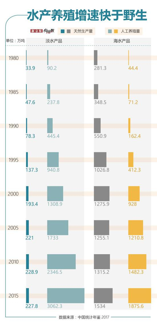 在中国,情况也是一样。国家统计局数据显示,2015年,中国水产品生产量为6700万吨,其中74%来自水产养殖业。1980年至2015年,中国淡水与海水水产品天然生长量年均分别增长16.3%和12.7%,淡水与海水水产品人工养殖量年均分别增长94.1%和117.8%。