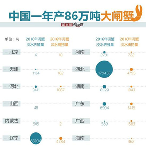 其实,国内的大闸蟹市场上,大部分螃蟹来自于江苏的兴化、高淳等以及湖北、安徽等地。据《中国渔业统计年鉴》,2016年,全国大闸蟹产量最高的江苏、湖北和安徽,三地的河蟹产量占到全国总产量的77%。