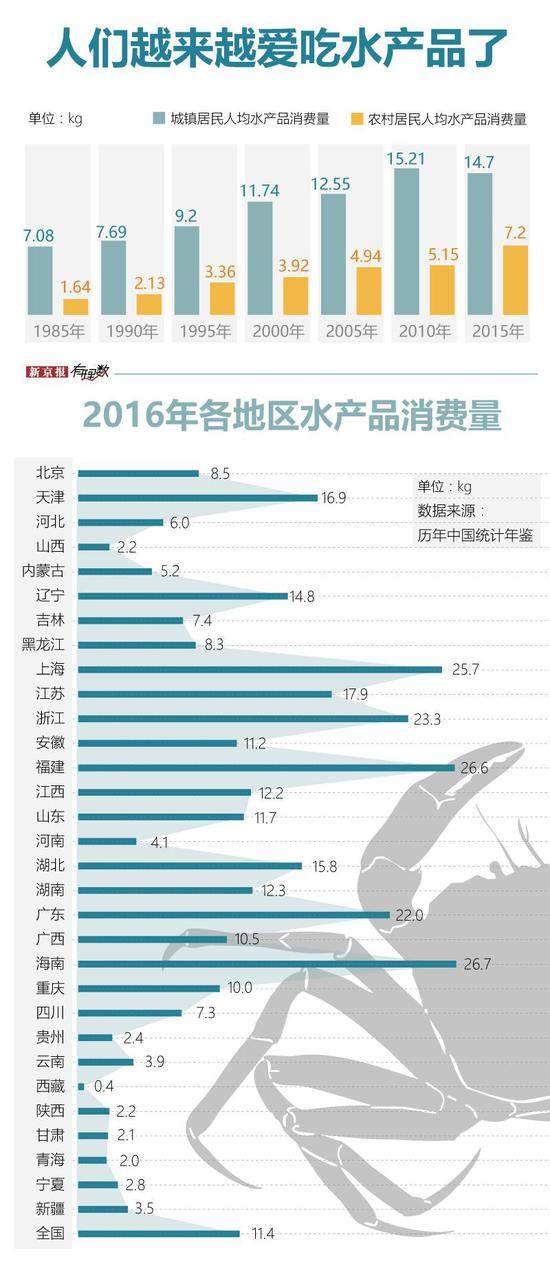 根据国家统计局《统计年鉴》,2015年,全国城镇居民人均水产品消费量为 14.7公斤,农村居民人均水产品消费量为7.2公斤,分别是三十年前的2.1倍和4.4倍。