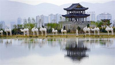 六个湖泊宛如六面巨大的镜子,镶嵌在北川大地上;24座各种形状的桥梁如同绸带连接起一个个湖泊、小岛;28组雕塑讲述西宁历史变迁故事;宁静的湖畔由10峰骆驼、4匹马、3个人(雕塑)组成的驼队“前行”,耳边仿佛响起丝绸之路上悠悠的驼铃声……