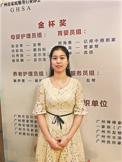 在今年举行的“羊城工匠杯”广州市家庭服务行业技能竞赛,广州市友帮家庭服务有限公司的张会常、广州亿邦中佣到家家庭服务有限公司的周海春、广州泰科物业管理有限公司的谢伊雯、广州市友帮家庭服务有限公司的邓玉珊分别获得了月嫂、育婴员、养老护理、家政服务4个组别的冠军。