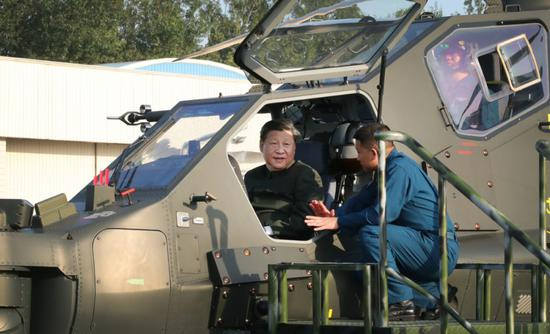 习近平27日来到第79集团军某陆航旅训练场,登上我国自主研制的直-10武装直升机,佩戴专用头盔,操控机载武器及观瞄系统,了解有关武装情况。