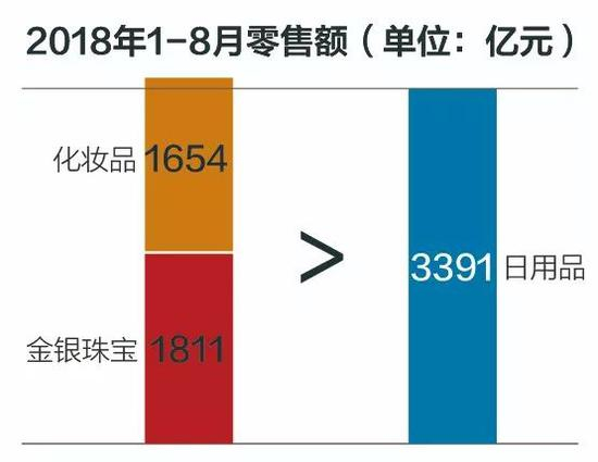 此外,女性爱美的支出猛增,化妆品加金银珠宝的消费额,已超过日用品。
