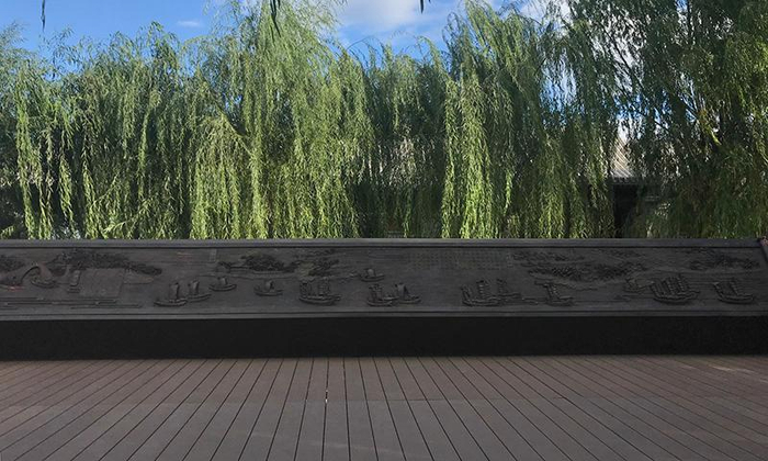 今天一早,记者沿着修复后的玉河南段行走,但见河水清澈蜿蜒、道路曲径通幽,两岸树影婆娑,周边宅院一新,体现出传统与现代的交融、动感与静态的和谐,爽心悦目,难怪引得不少人驻足拍照。值得一提的是,在玉河南段大约170米长的岸边,名为《京杭大运河风物图》的铜铸浮雕长卷展现出来,从北到南,幽州、微山湖、淮安、扬州、瓜州古渡、无锡、苏州,直到杭州,沿途的风物习俗包括沧州武术,吴桥杂技、临清砖窑,以及古人的经贸活动和劳作场面等等,一一呈现。在画卷重要之处,还刻有古诗,画龙点睛,更显文化韵味。