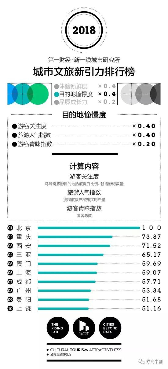 3个维度中,我们分别给予体验新鲜度与目的地憧憬度两者0.4的权重,其中前者涵盖了我们对“文旅”与“新引力”的理解,后者是人们“用脚投票”的结果。至于品质成长力,它是一个天然具备未来指征的指标,当然其中还有很多不确定性,因此权重赋为0.2。
