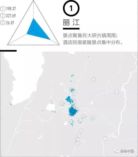 我们计算了景区周边1公里范围内餐馆、酒店与厕所的数量和以用户评分代表的质量。配套设施离景点越近得分就越高。丽江和乌镇是典型的古镇式旅游城市,酒店也多集中于此,而上海因为城市化程度更高,酒店和民宿几乎全域分布。