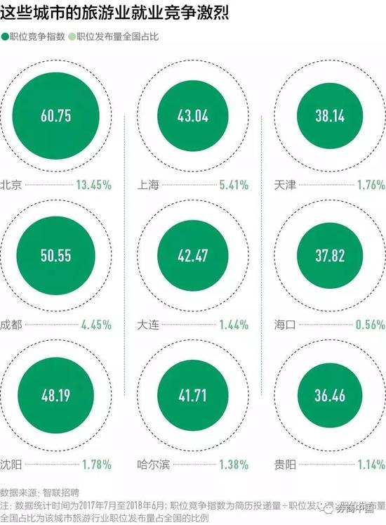 旅游人力指数考量的是一个城市的旅游业人才吸引力。从住宿、餐饮、景区到公共交通,高水平的城市旅游体验,背后需要整个城市高水平服务人才提供支撑。智联招聘的数据显示,杭州的旅游及餐饮服务业平均薪资在新一线城市中最高,它能吸引更多人加入这个城市的旅游行业。而北京和成都旅游行业求职竞争指数更激烈,而竞争更激烈的地方往往意味着更多高水平的管理人才的聚集。