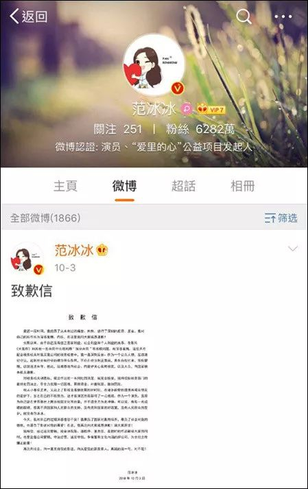 由于范冰冰是在“超话”的版块上对粉丝发声,在范冰冰本人的微博上,并没有这条帖子,最近的微博仍是10月3日的“致歉信”。而这条深夜微博,已经获得过万转发。