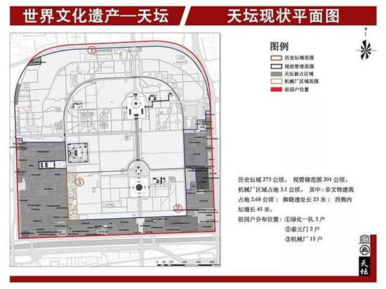 “即使这样,仍有约72公顷土地被占用。”李高介绍,天坛被占位置主要集中于三南(西南、南、东南)外坛区域,历史上,包括神乐署、牺牲所、钟楼、銮驾库、石牌楼、崇雩坛及舆路等在内的众多遗址遗迹分布在该区域。被占区域内,有中央级直属单位、企业、事业单位等47家,占地39.56公顷;同时,还有居民社区15处,占地24.13公顷,总计199栋楼3万多居民。