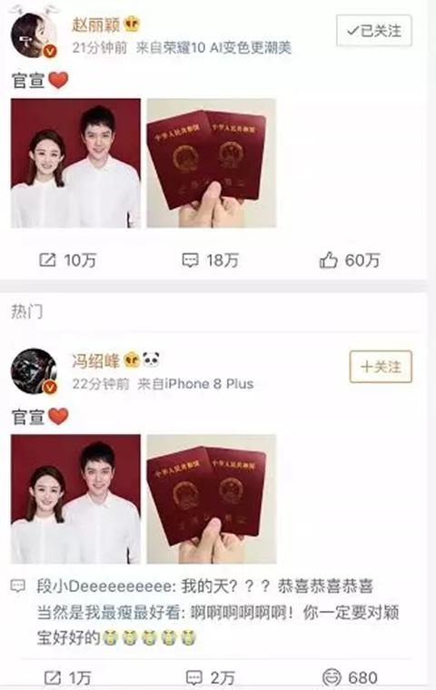 ▲赵丽颖、冯绍峰微博“官宣”结婚。