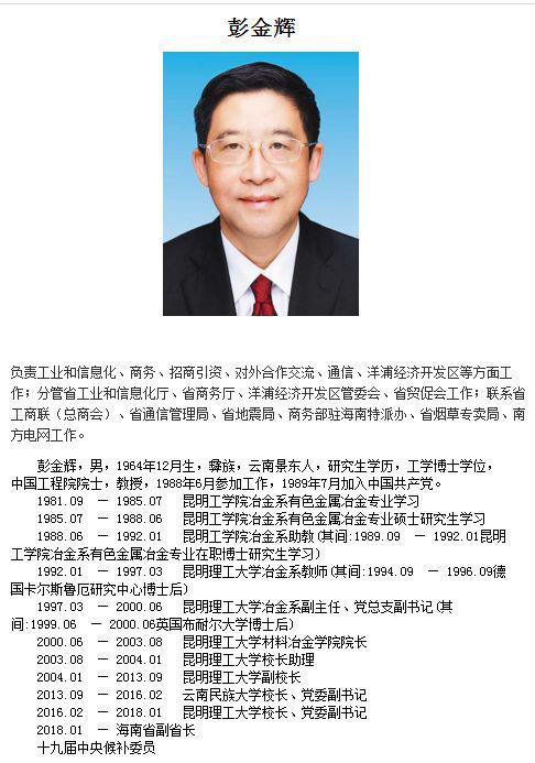 2018年1月,时任昆明理工大学校长的彭金辉履新海南省副省长,负责“工业和信息化、商务、招商引资、对外合作交流、通信、洋浦经济开发区等方面工作”。
