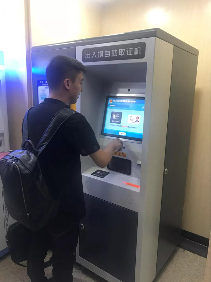 群众按照自助流程,在出入境自助领证机上领取证件。