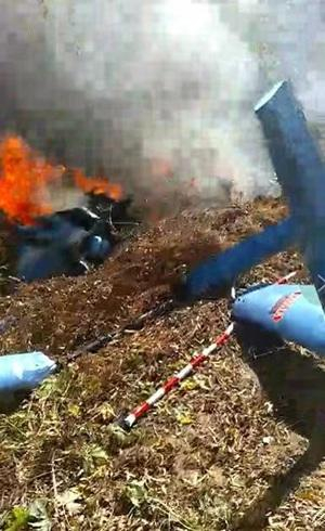 目击者网传视频显示,坠机现场有明火燃烧、腾起白烟,并可见蓝色机翼。视频截图