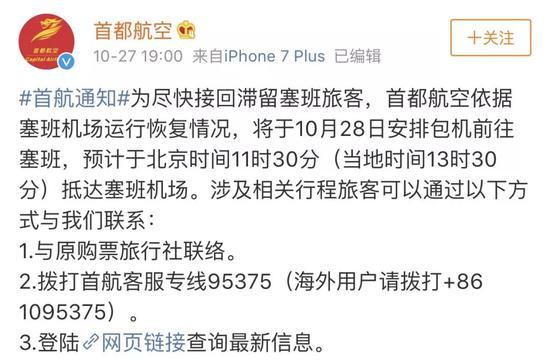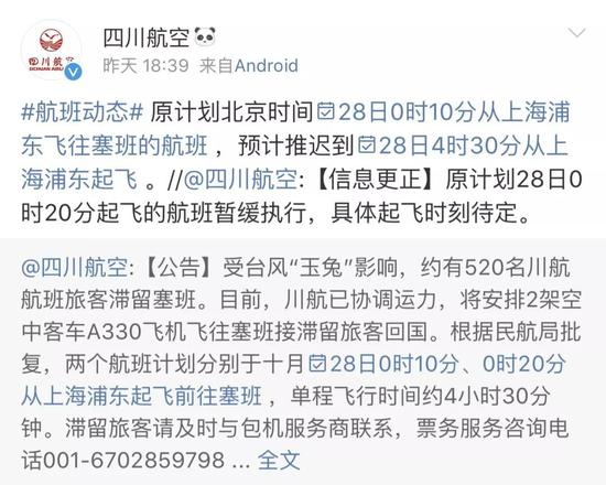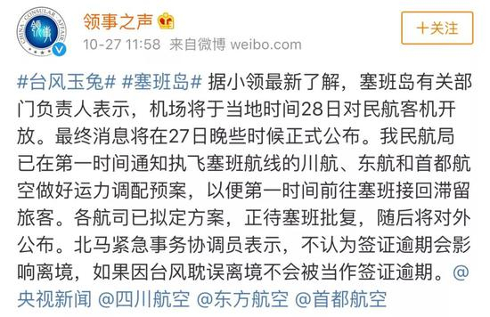 香港航空由塞班返回香港的航班计划将于当地时间下午4点半起飞,航班号为HX1077。东方航空昨天晚上发布通告说:为保障航班运行安全,东航取消10月30号至11月14号塞班至北京往返航班。对10月27号塞班至北京MU764航班做顺延,推迟至机场符合飞行安全标准后执行。东航将根据当地机场恢复情况,动态调整航班运行计划,安全运输滞留旅客。