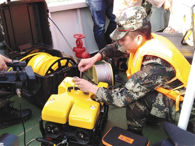昨日16时30分左右,携带高清摄像设备的水下机器人开始下潜。图为武警重庆总队船艇支队在调试水下机器人。