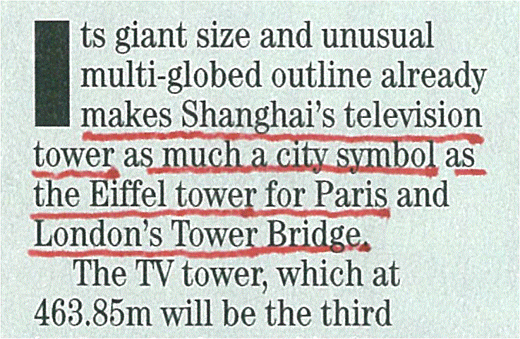 这一目标后来得到了实现。第一篇刊登东方明珠的外国杂志《Construction Today》(今日建筑),连同封面共登了5个版面,一开头就把东方明珠与世界著名建筑相媲美,说“巴黎有埃菲尔铁塔,伦敦有塔楼,上海有东方明珠”。