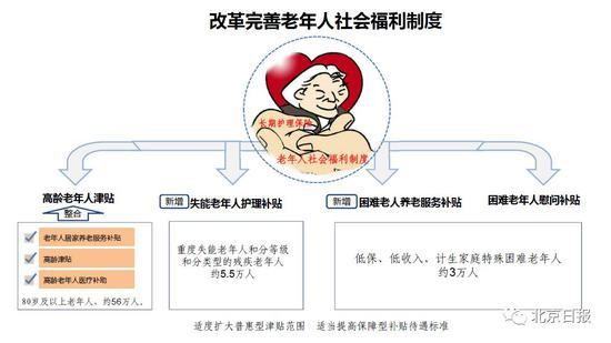 为有效缓解老年人生活照料困难,《实施意见》提出,将老年人居家养老服务补贴、高龄津贴、高龄老人医疗补助整合为高龄津贴制度,增设困难老人养老服务补贴和失能老人护理补贴,与困难老年人慰问补贴一起,构成本市全新的老年人养老服务补贴津贴制度。同时,根据本市经济社会发展情况,适度扩大普惠型津贴范围,适当提高保障型补贴待遇标准。