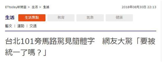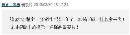 更多的网友看到新闻后表示“一头雾水”:“这些简体字,台湾用了几十年了,和统一不统一扯不上什么关系,尤其是路上的标识,好懂最重要!”